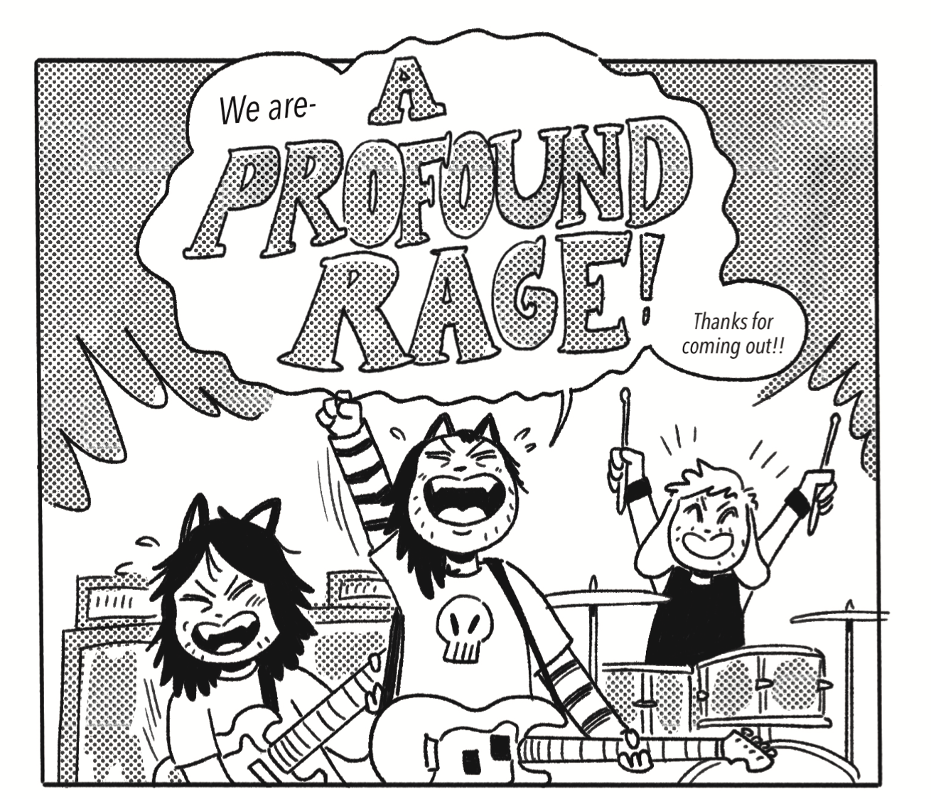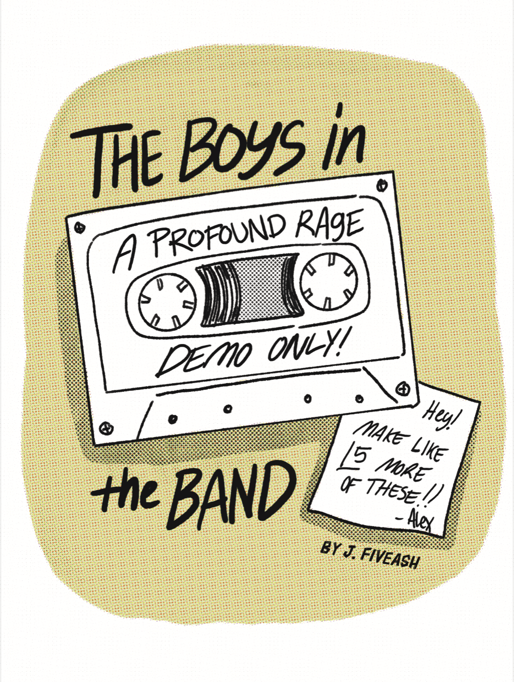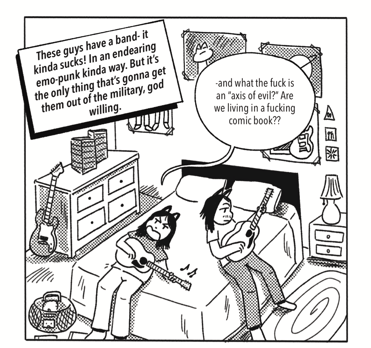 A silly 12 page comic about emo boys in 2002 just trying to make it as a band in a homophobic, war-obsessed world. Created in a haze of two weeks in September 2025. Printed in Los Angeles.