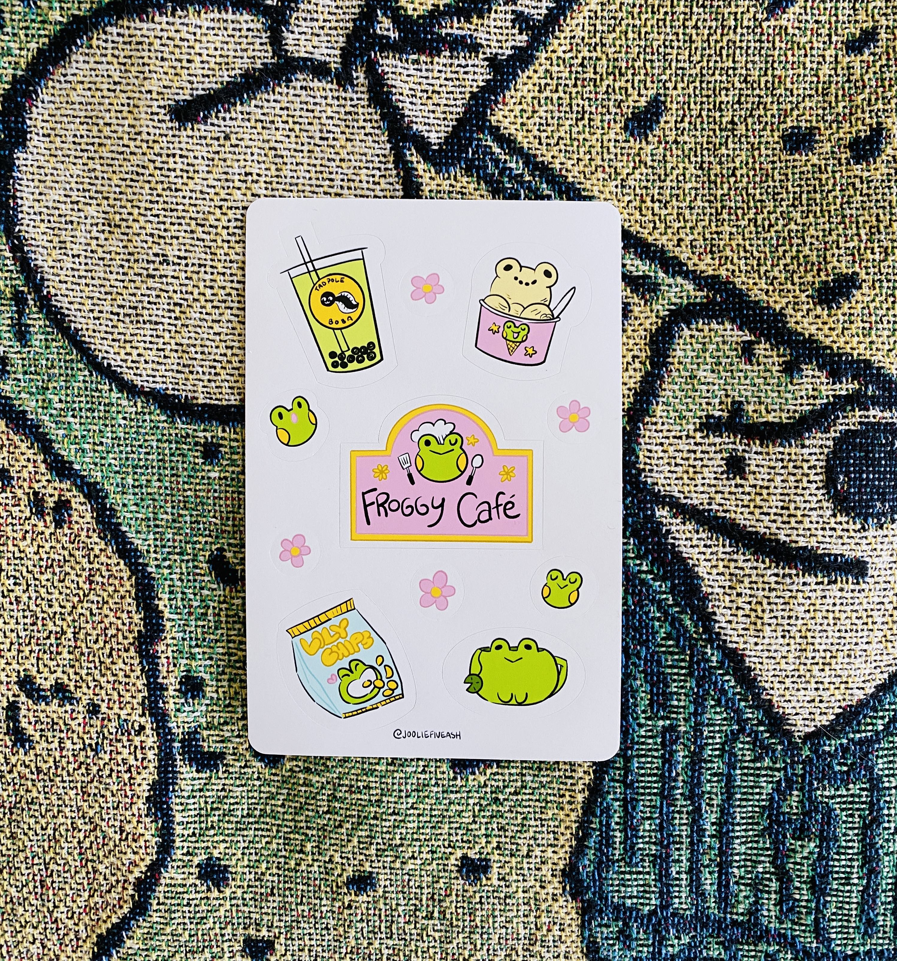 Serving up some Tadpole Boba is the Froggy Cafe! Sticker sheet is matte and comes with 11 stickers to stick on your waterbottle, laptop, or whatever!