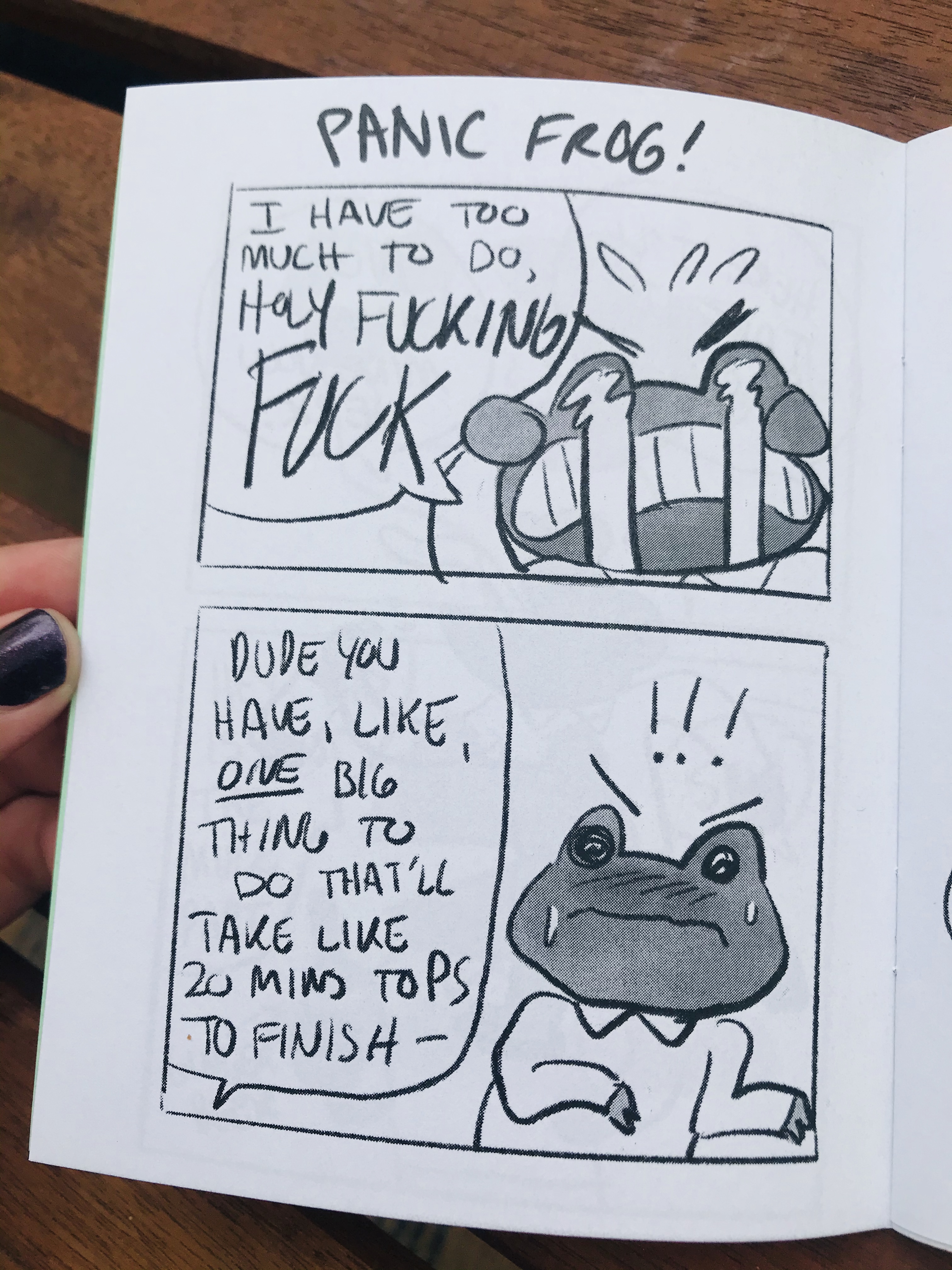 16 pages of a Frog's exploits with anxiety, depression, gender non-conformity, and more! You know, regular froggy goodness. Originally printed in 2019 with the colored cover printed in Sept 2024.